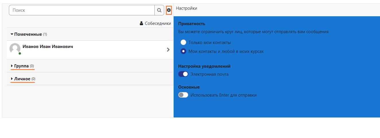 - В разделе «Сообщения» можно настроить приватность отправки вам сообщений, а также общаться с преподавателями и другими обучающимися.