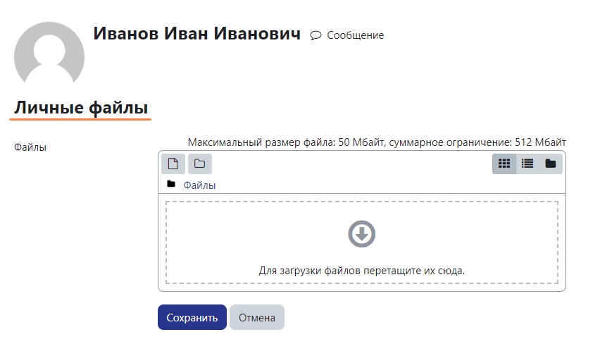 - В разделе «Личные файлы» можно размещать документы, доступные только вам, с максимальным размером файла: 50 Мбайт, а суммарное ограничение: 512 Мбайт.