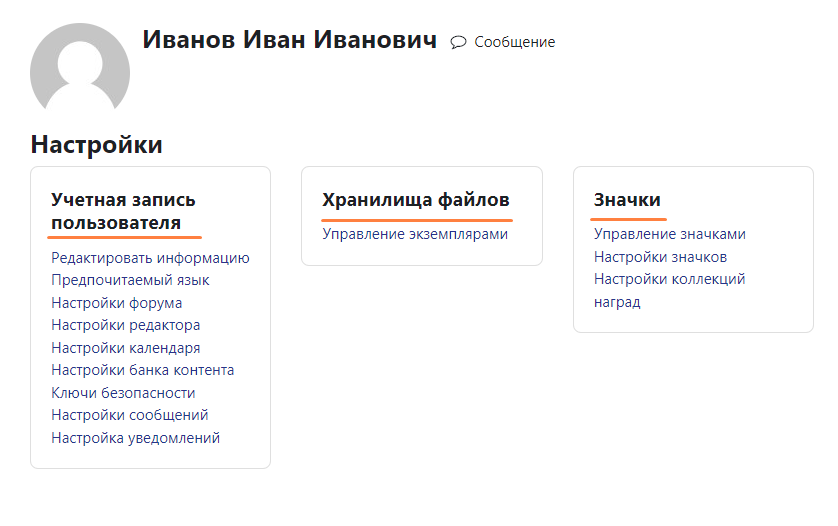 - Раздел «Настройки» позволяет редактировать учетную запись профиля (только доступные для редактирования поля), управлять файлами и значками.