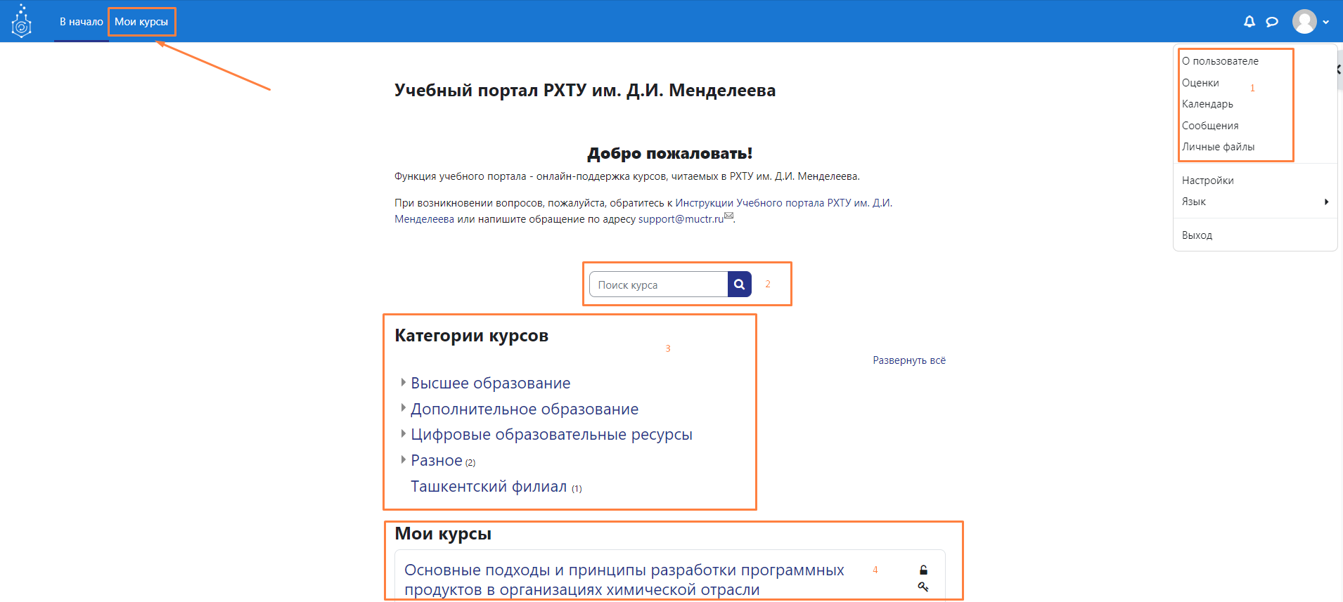 В случае, если требуется самостоятельная запись, вам необходимо узнать название курса. Чтобы найти по названию и записаться, воспользуйтесь поиском по курсам. - Подробнее ознакомиться с полученными оценками на курсах можно в разделе «Оценки».