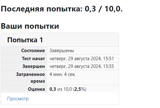 По окончанию теста вам отобразиться итоговая оценка и оставшееся количество попыток. Для оспаривания результата теста обратитесь к преподавателю вашего курса. |