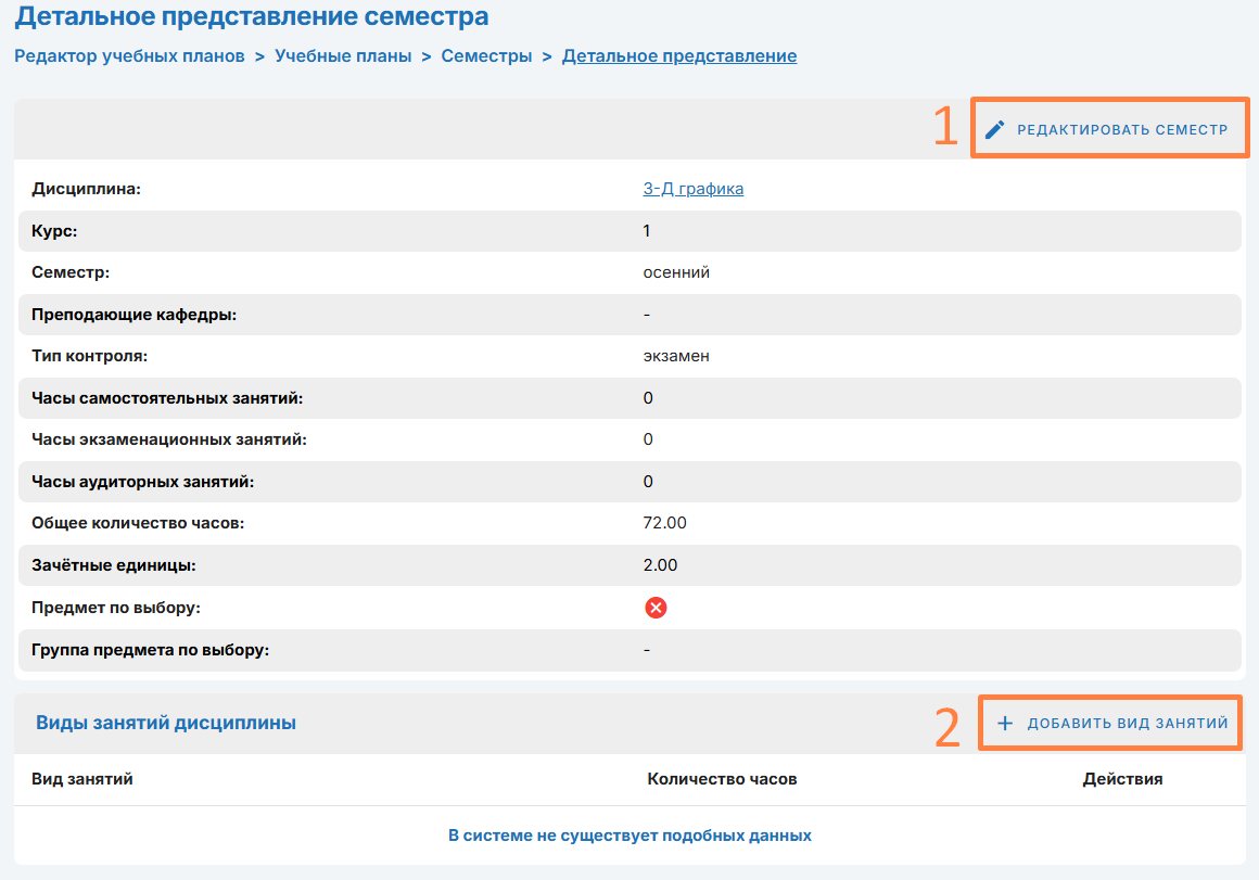 При выборе семестра откроется страница «Семестр дисциплины». На странице можно отредактировать семестр (1) и добавить виды занятий в дисциплине (2). |