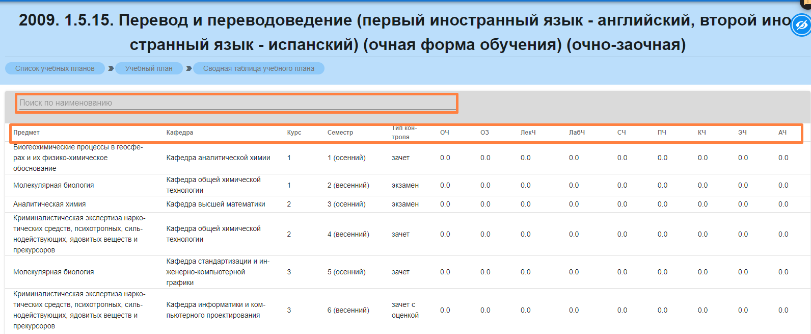 •  Сортировки по столбцам: Предмет, кафедра, курс, семестр, тип контроля, ОЧ, ОЗ, ЛекЧ, ЛабЧ, СЧ, ПЧ, КЧ, ЭЧ, АЧ.