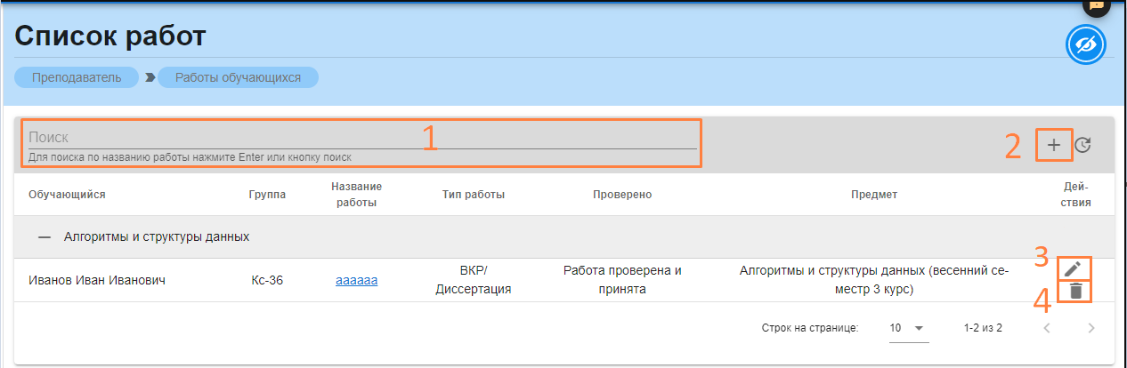 - Найти работу по названию в поле «Поиск» (1);