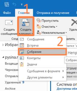 Для бронирования кабинета нажмите «Создать элемент» (1). В открывшемся меню выберите пункт «Собрание» (2).
