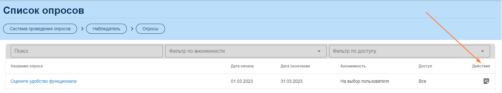 Для выгрузки данных зайдите в "Опросы" левого бокового меню. Далее нажмите на значок  в строке опроса.
