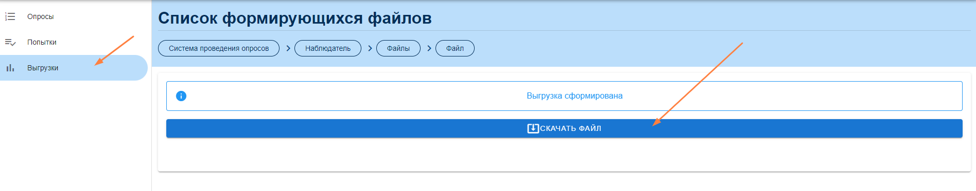После нажатия автоматически будет открыта вкладка "Выгрузки", в ней необходимо нажать "Скачать файл" после формирования выгрузки.