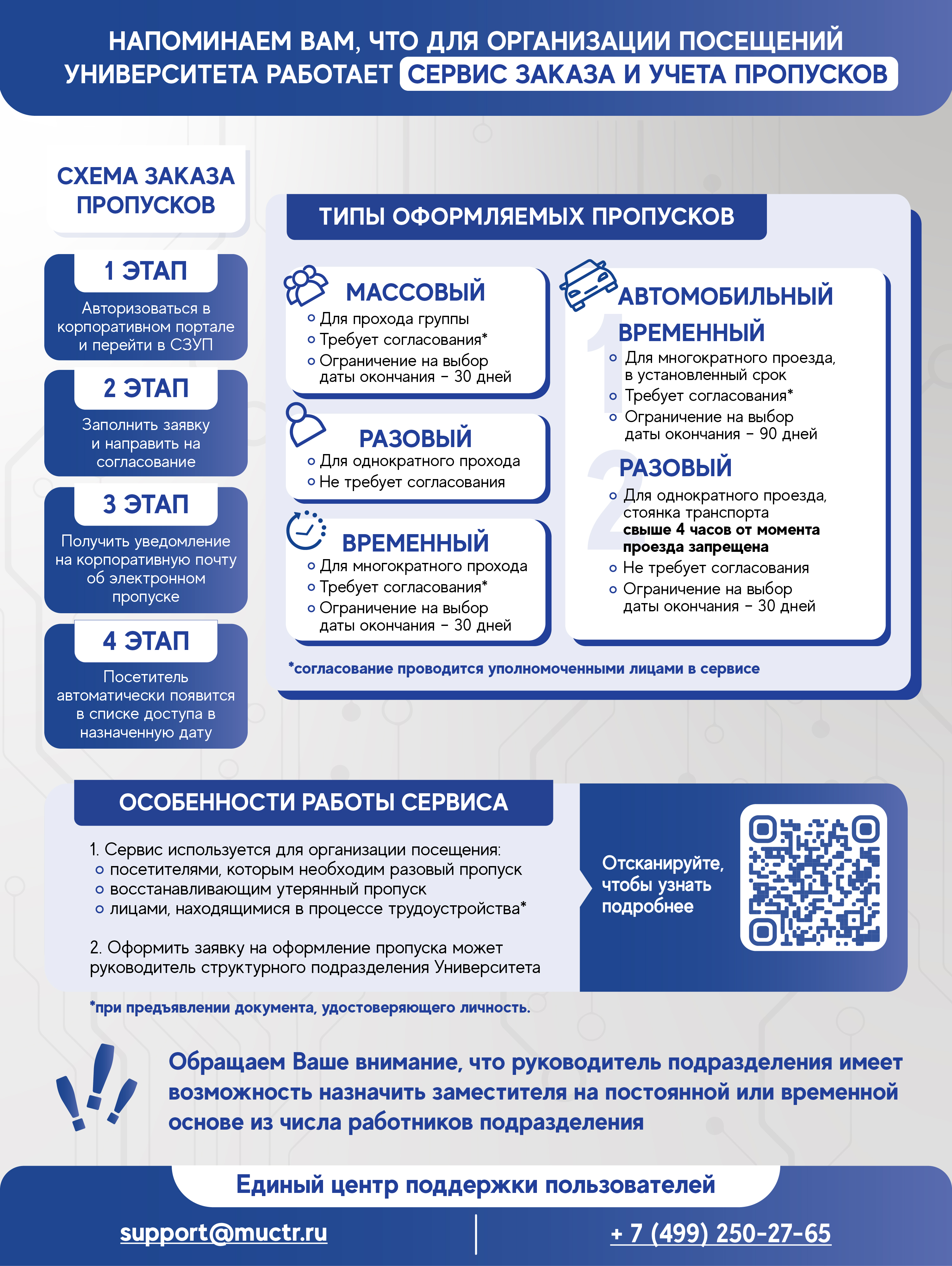 Сервис заказа и учета пропусков (passorder.muctr.ru)— сервис для автоматизации процесса оформления заявок, а также контроля входа и выхода посетителей через проходную.