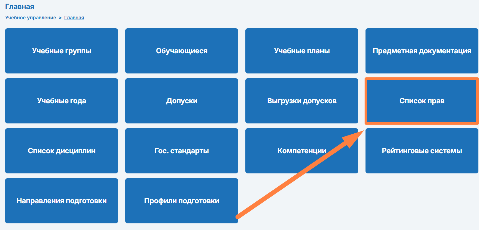 Для открытия списка работников и выданных им прав на странице «Главная» нажмите «Список прав».