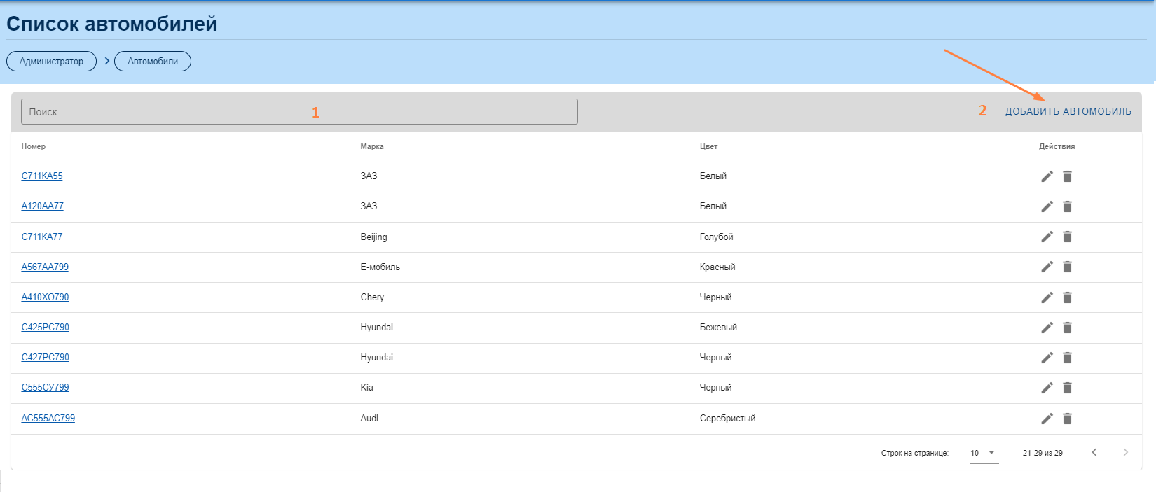 После нажатия открывается список. Для поиска воспользуйтесь строкой «Поиск» (1), для добавления автомобиля в систему — нажмите кнопку (2) и заполните открывшуюся форму.