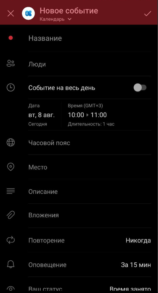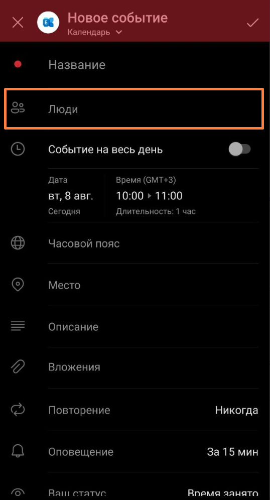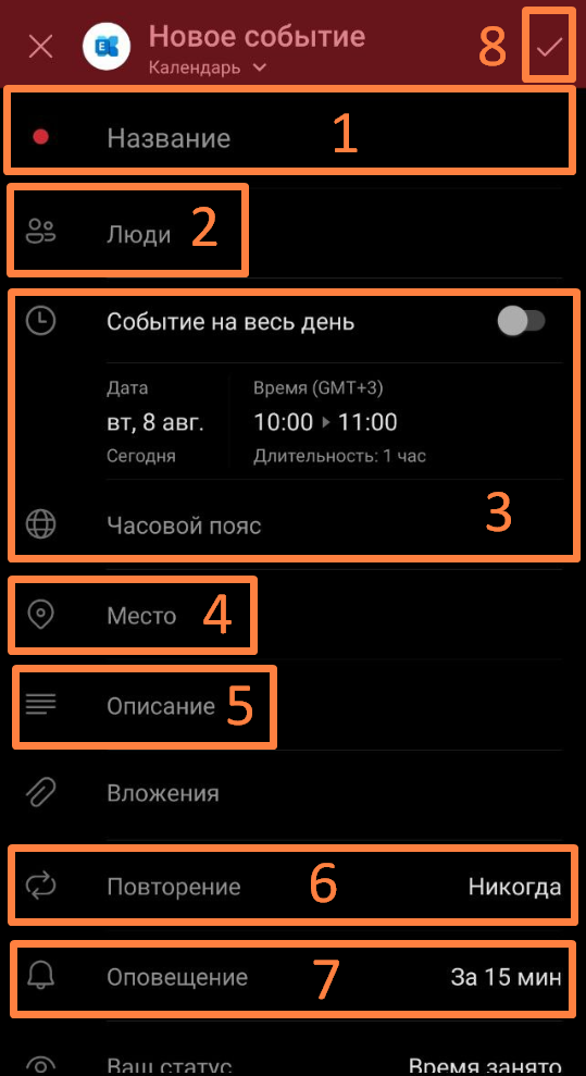 В форме события заполните параметры: название (1), люди (2), даты и время (3), место (4), описание (5) (при необходимости), функции повтора (6) и напоминания (7).