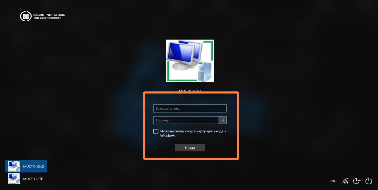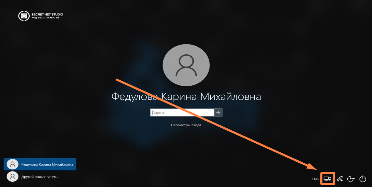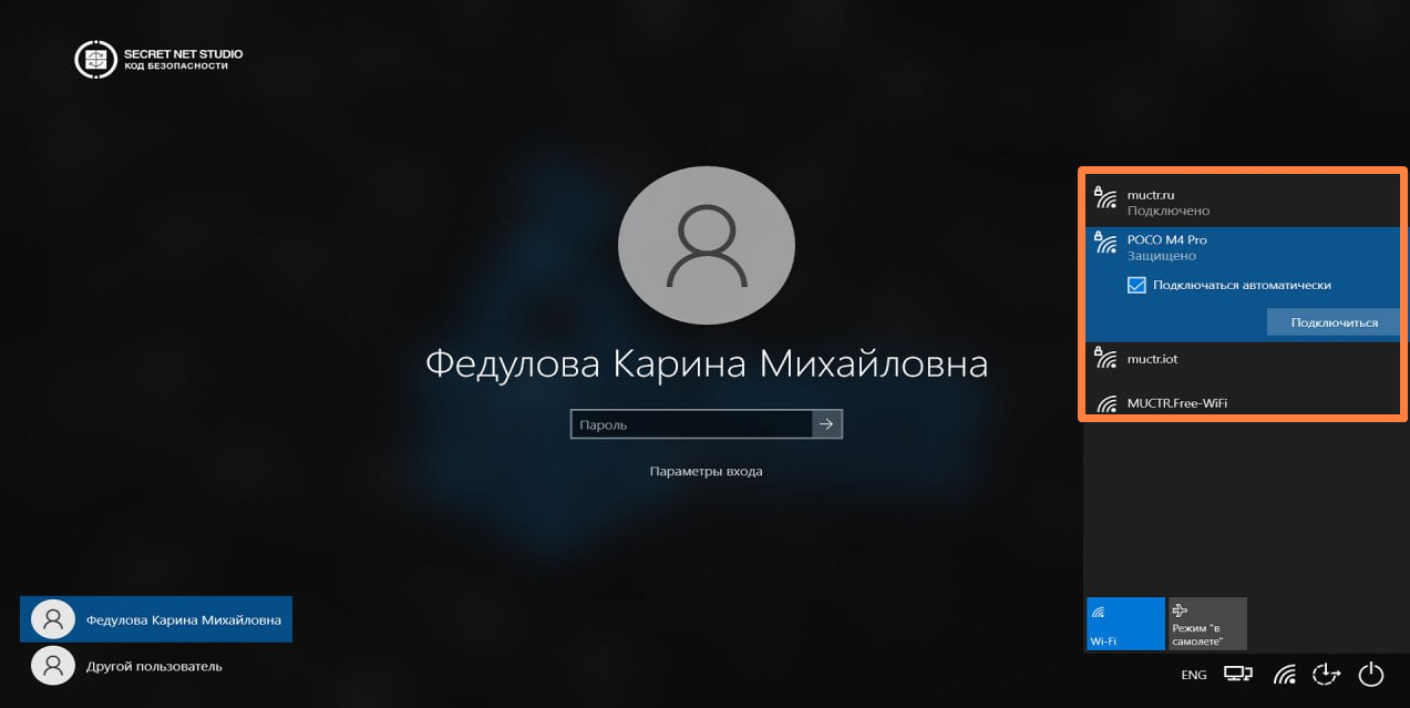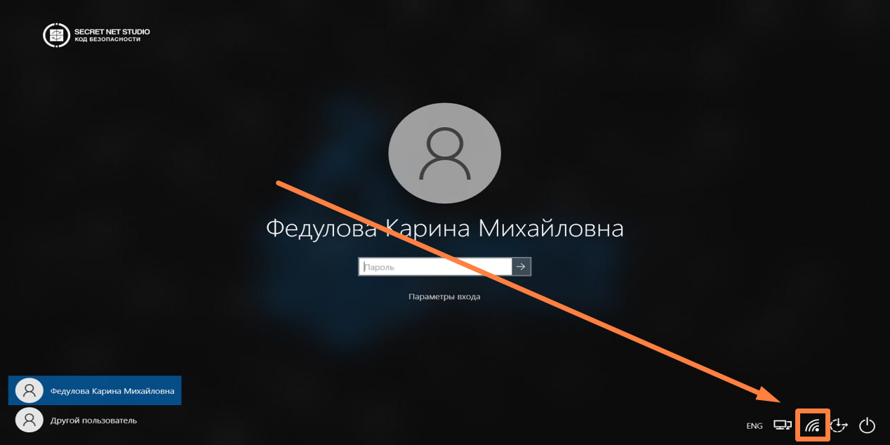 На экране аутентификации в АРМ откройте меню подключения к сети в правой нижней части экрана