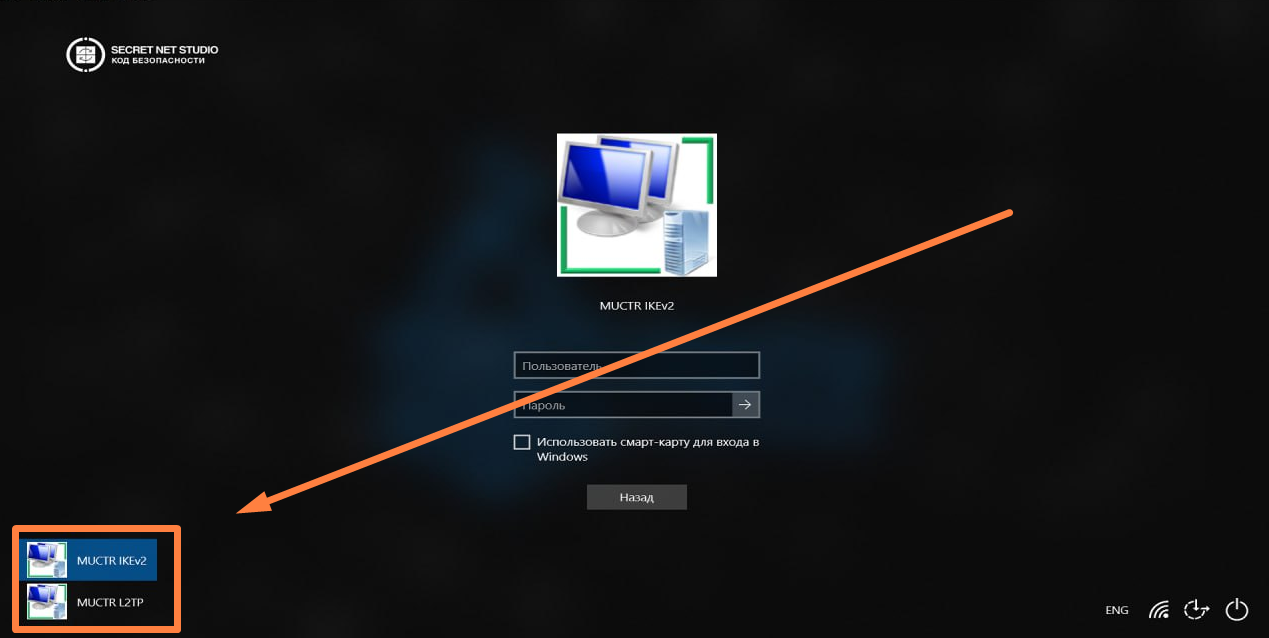 В открывшемся меню, в левом нижнем углу экрана, выберите одну из сетей MUCTR (IKEv2 или L2TP)