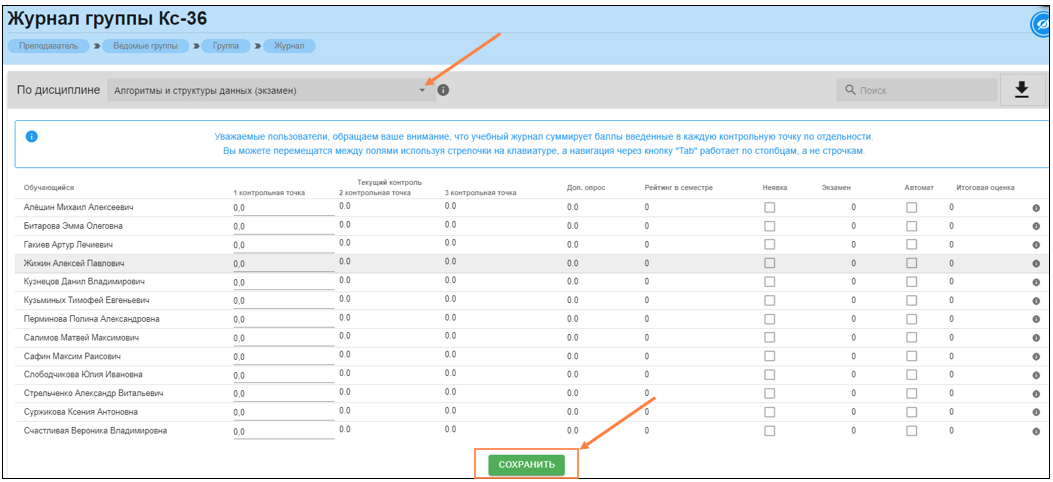 После откроется журнал выбранной группы. Для смены дисциплины нажмите значок списка. После завершения редактирования нажмите "Сохранить" внизу страницы.