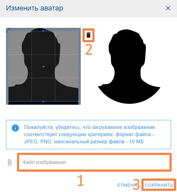 В открывшемся окне выберите файл с изображением (1) для загрузки в систему. Для удаления старого аватара нажмите Нажмите «Сохранить» (3), после чего произойдет сохранение аватара в системе с последующим закрытием формы.