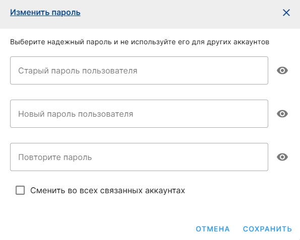 В открывшейся форме введите старый пароль и новый в соответствующих строках Для создания одинакового пароля для всех связанных учетных записей выберите пункт «Сменить во всех связанных аккаунтах»