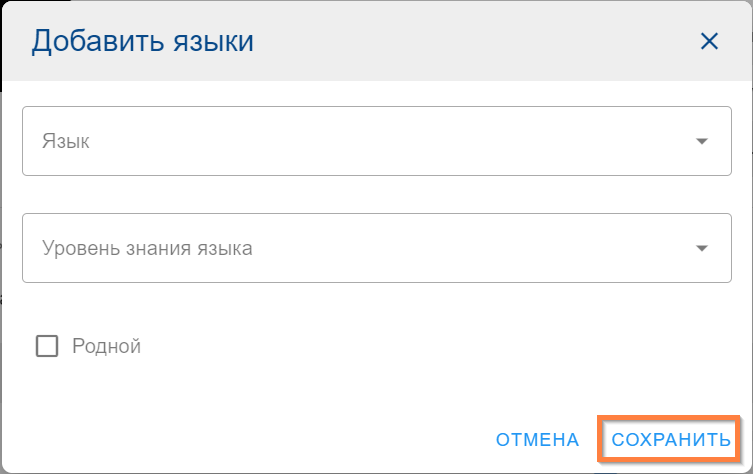 В открывшемся окне в соответствующих строках необходимо выбрать язык и уровень знания и нажать на кнопку "Сохранить"
