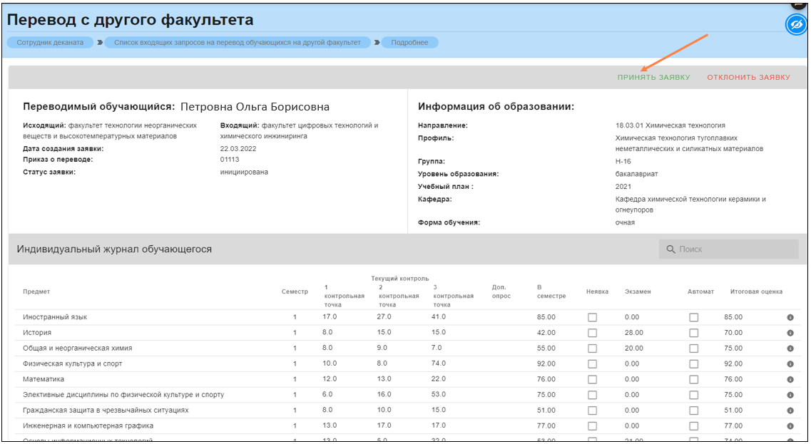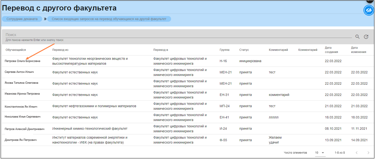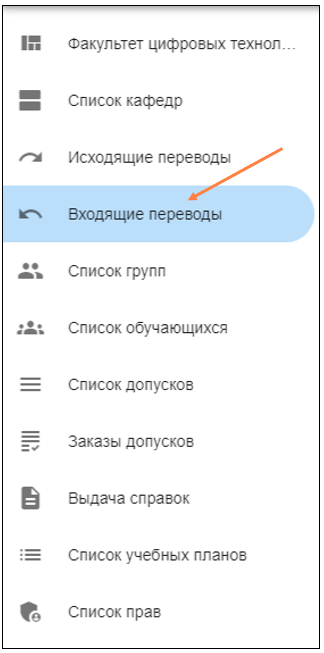 Для принятия обучающегося с другого факультета выберите "Входящие переводы".