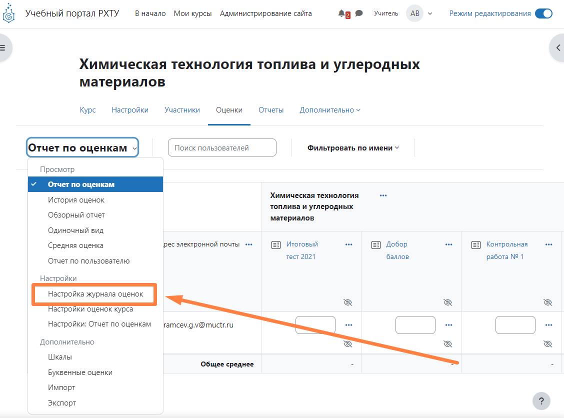 Затем перейдите в селектор журнала и выберите пункт «Настройка журнала оценок»