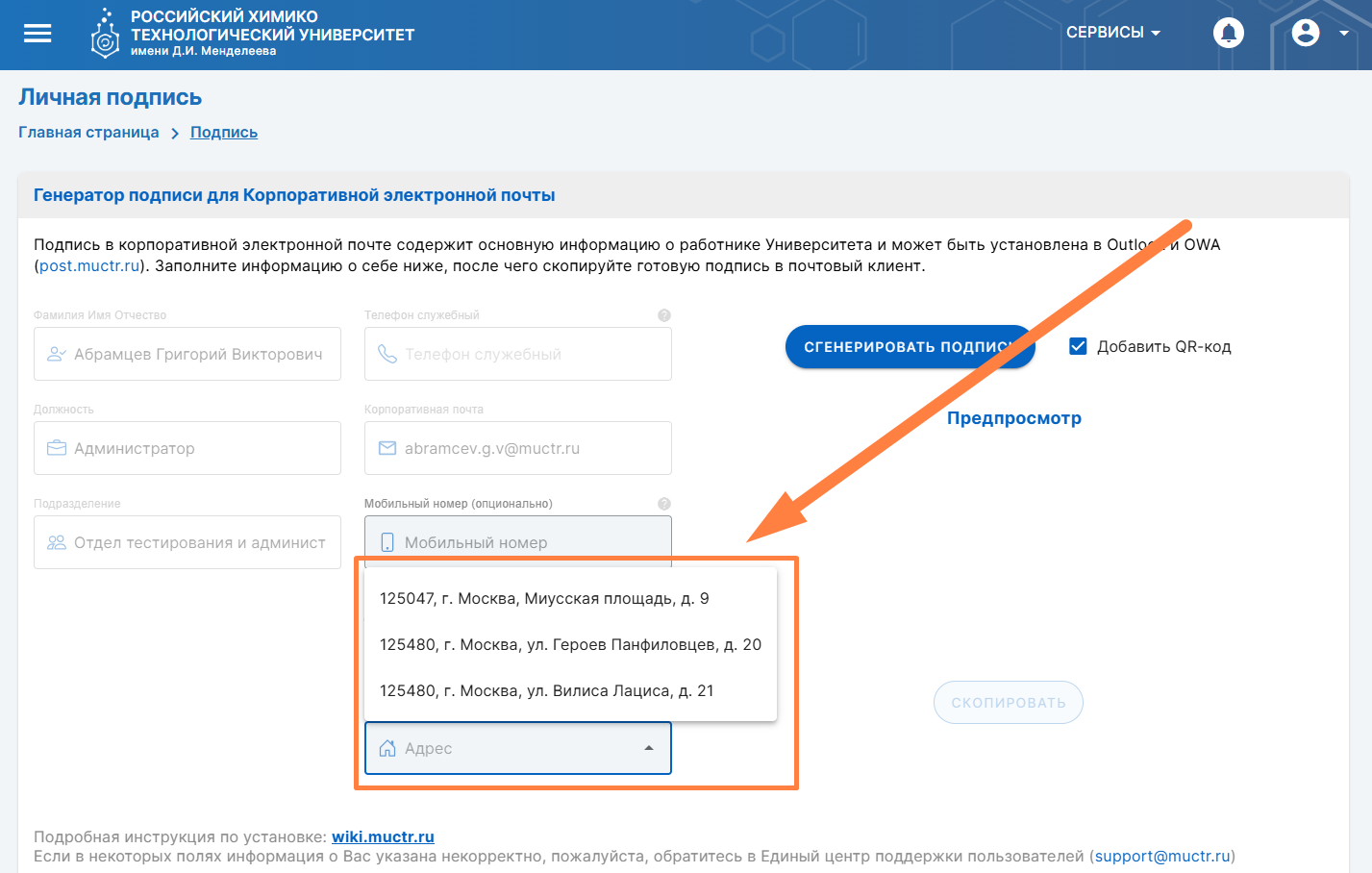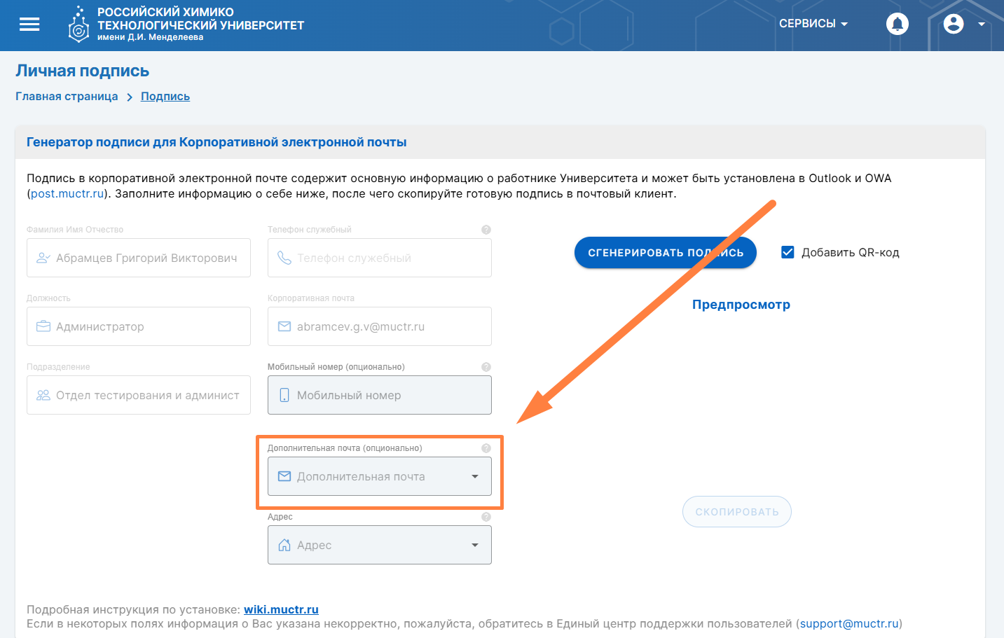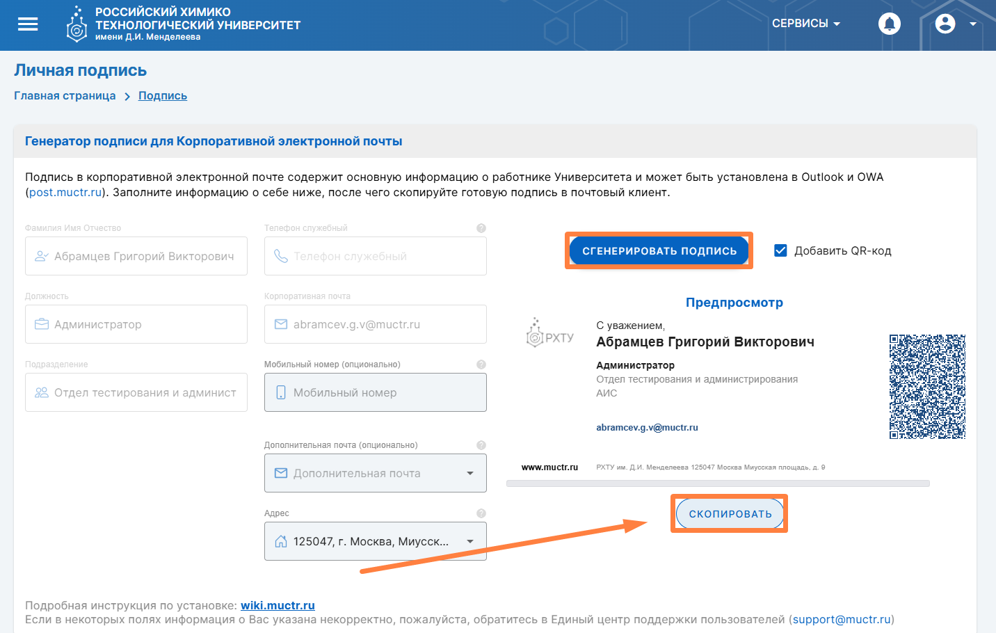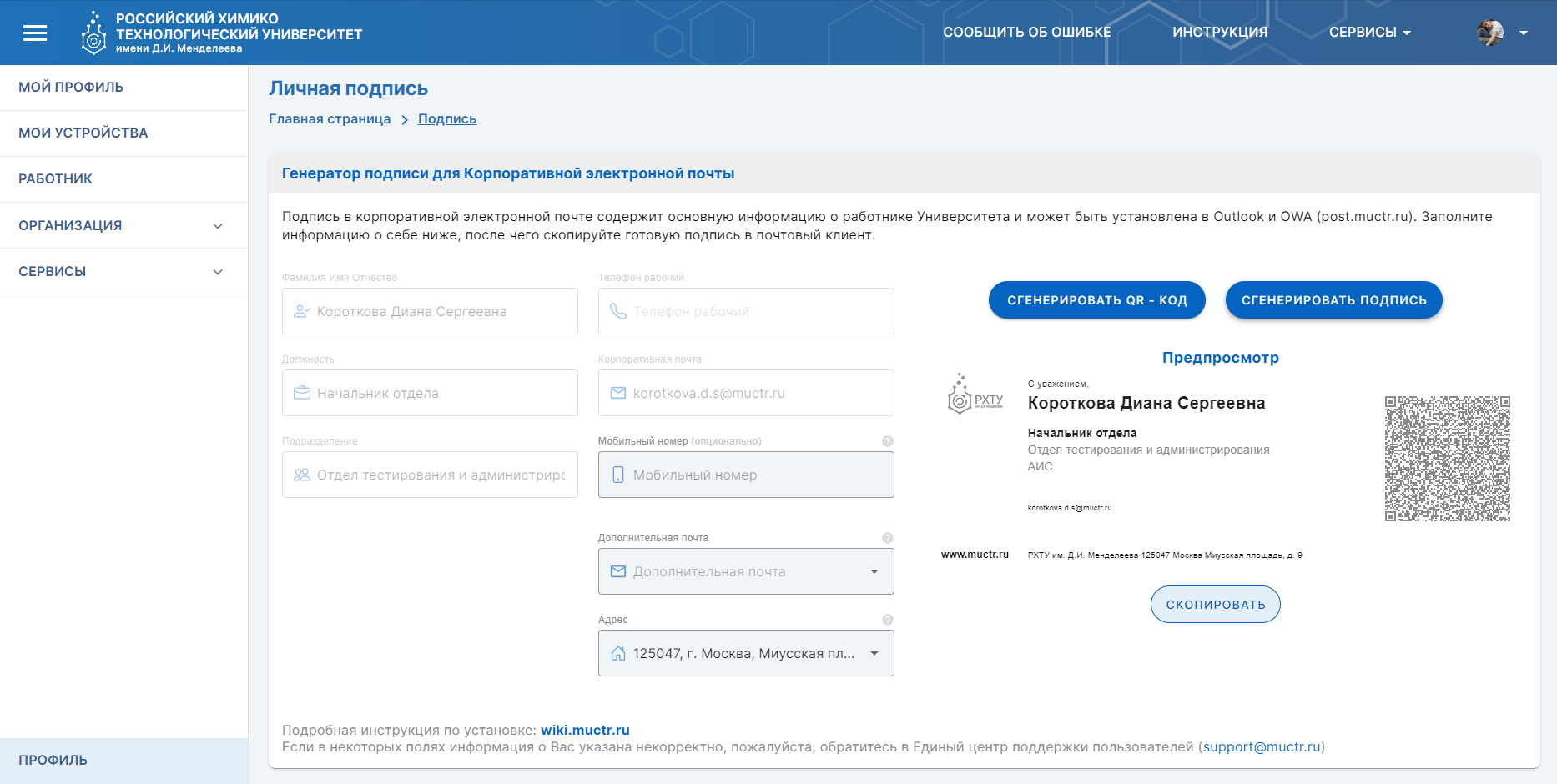Сервис «Личная подпись» предназначен для удобной генерации личной подписи с актуальной информацией о работниках РХТУ им. Д.И. Менделеева.