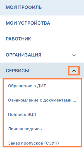 Раздел «Сервисы» содержит ряд корпоративных сервисов взаимосвязанных с корпоративной учетной записью работника |