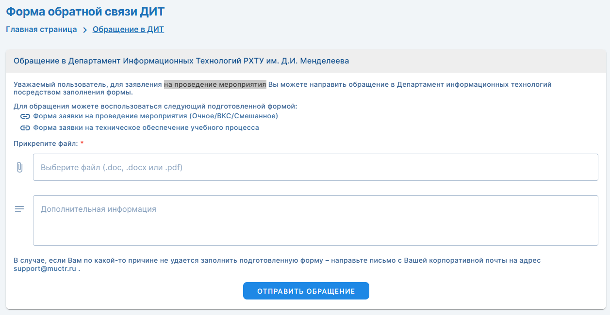 Корпоративные сервисыРаздел «Обращение в ДИТ» - предназначен для формирования заявок на проведение мероприятий