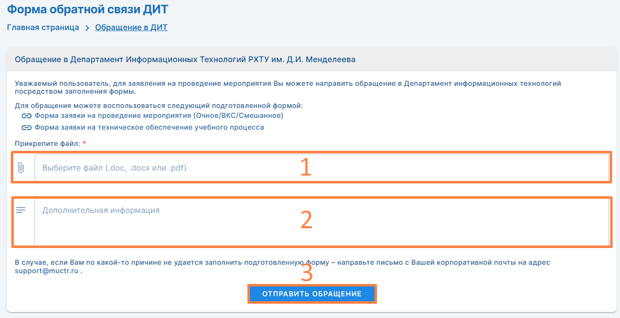 Также при необходимости укажите дополнительные сведения (2) и нажмите «Отправить обращение» (3).