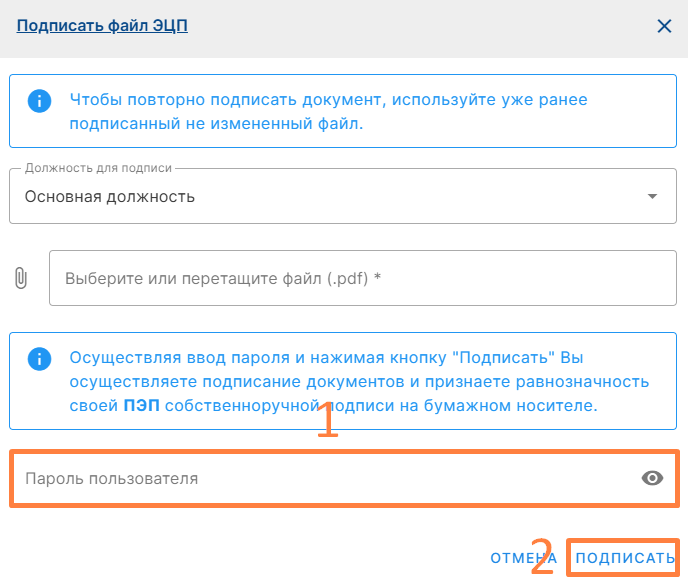 После выбора файла введите ваш пароль от Корпоративной учетной записи (1) и нажать кнопку «Подписать» (2)