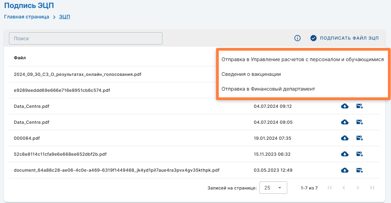 Для скачивания подписанного документа нажмите Для отправки подписанного документа подразделение нажмите