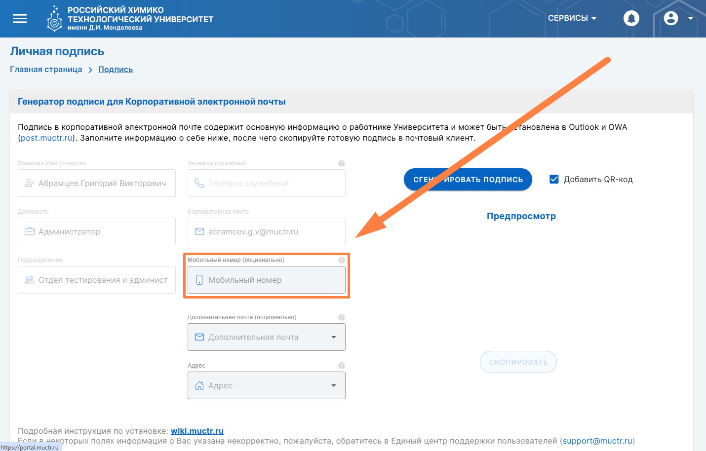 Рабочий номер телефона/электронная почта заимствуется из указанной информации в Личном профиле работника. Настройка личной подписиЧтобы добавить дополнительный мобильный номер, пожалуйста, укажите его в разделе «Мобильный номер» и сгенерируйте подпись. После этого в вашей подписи будет отображаться указанный вами номер.